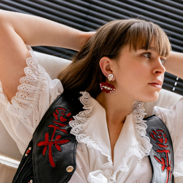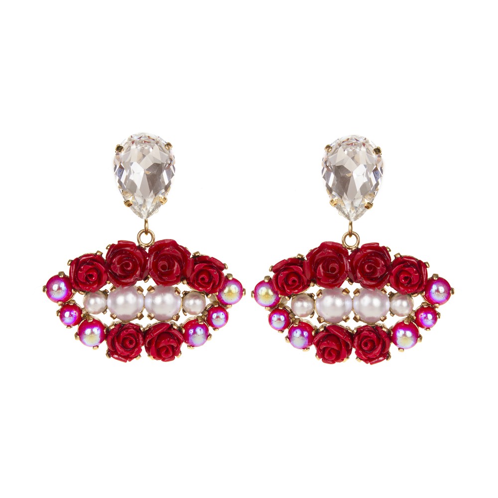 The red lips earrings are made out of a gold base and embellished with crystals, white pearls and red iridescent pearls and red resin flowers.