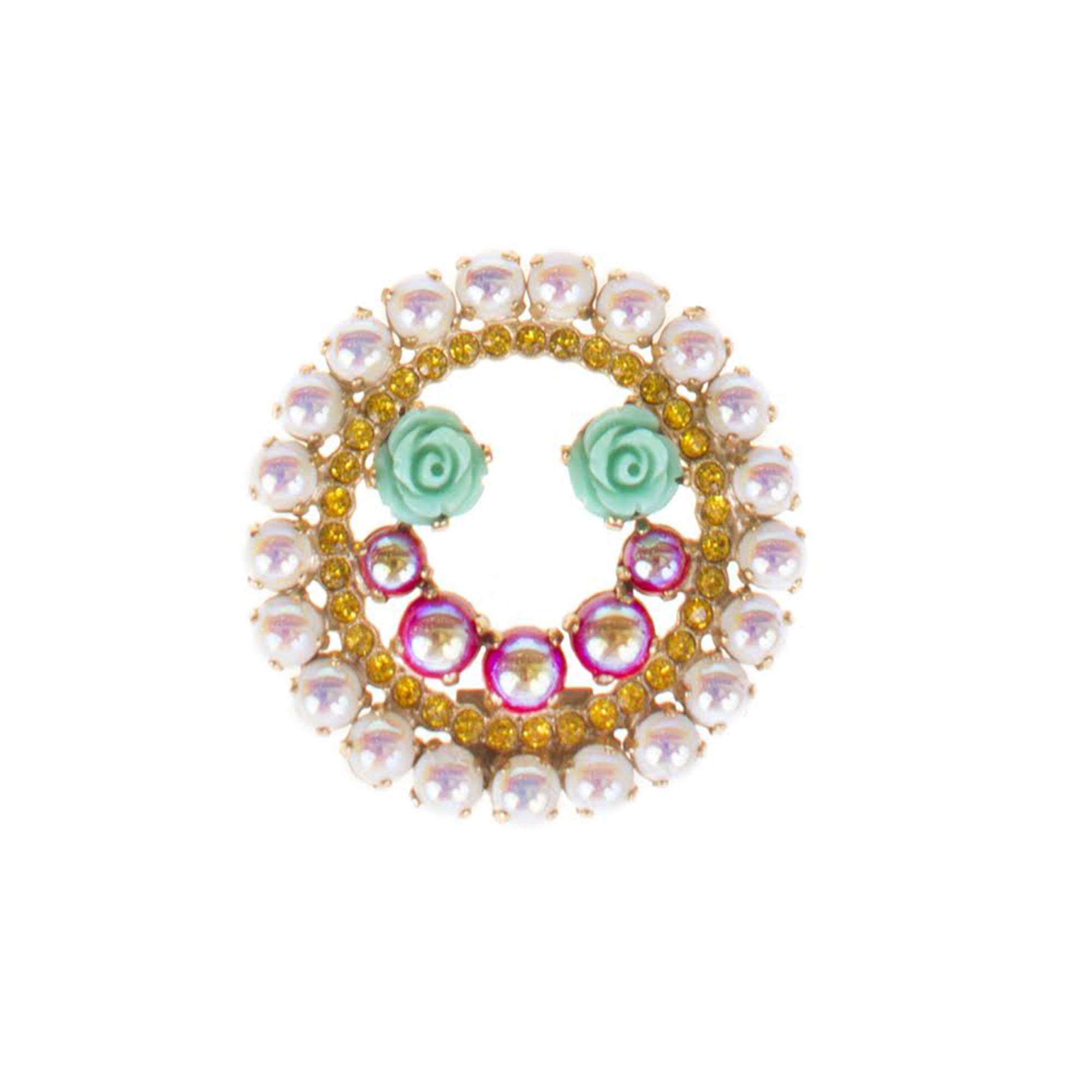 The smiley brooch is made out of a gold base and embellished with white and red iridescent pearls, crystals and two torques resin flowers.