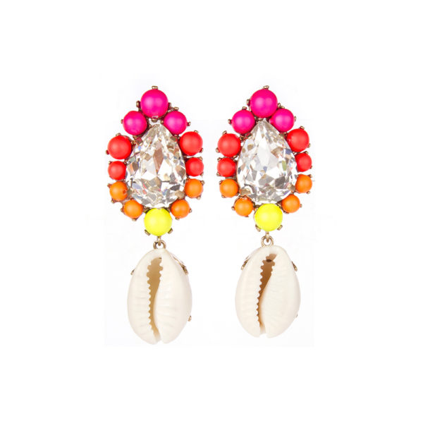 Boucles d’oreilles à clip en métal doré à l’or fin, serties de cristaux et de perles néon Swarovski ainsi que de coquillages.