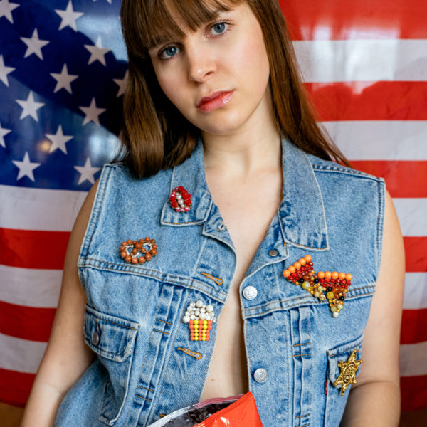 Broche en métal doré à l’or fin, sertie de perles néon Swarovski, de cabochon en verre, ainsi de pierres naturelles : bambou de mer rouge , cornaline, goldstone, agathe noire et jaune.