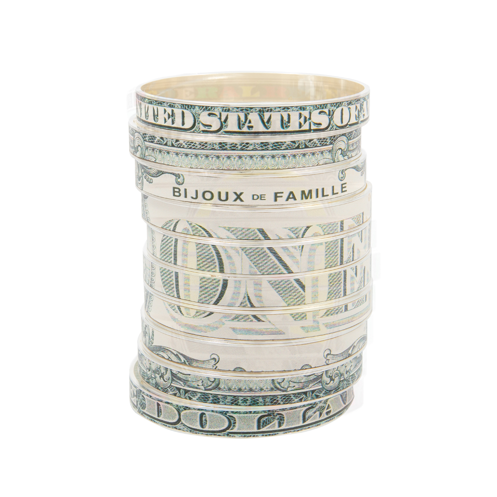 Set de 10 bracelets métallisés or, serti d’imprimés numériques.